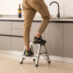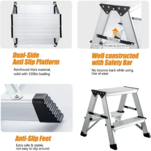 - 【Security & Stability 】- The metal step stool is made of high quality thick aluminum alloy material, strong and soild with four anti-slip feets and anti-slip lines are added to the step platforms to ensure non-slipy. To reinforce the stability, anti-movement safty lock bars are added both size of the stool to make sure it stay in place no bounce back while using – extra security to make you use at ease. The triangular structure is stable and with strong loading capacity of 330 Pounds/150KG, aluminum metal 2 step ladder is a quality stool that can last for years.